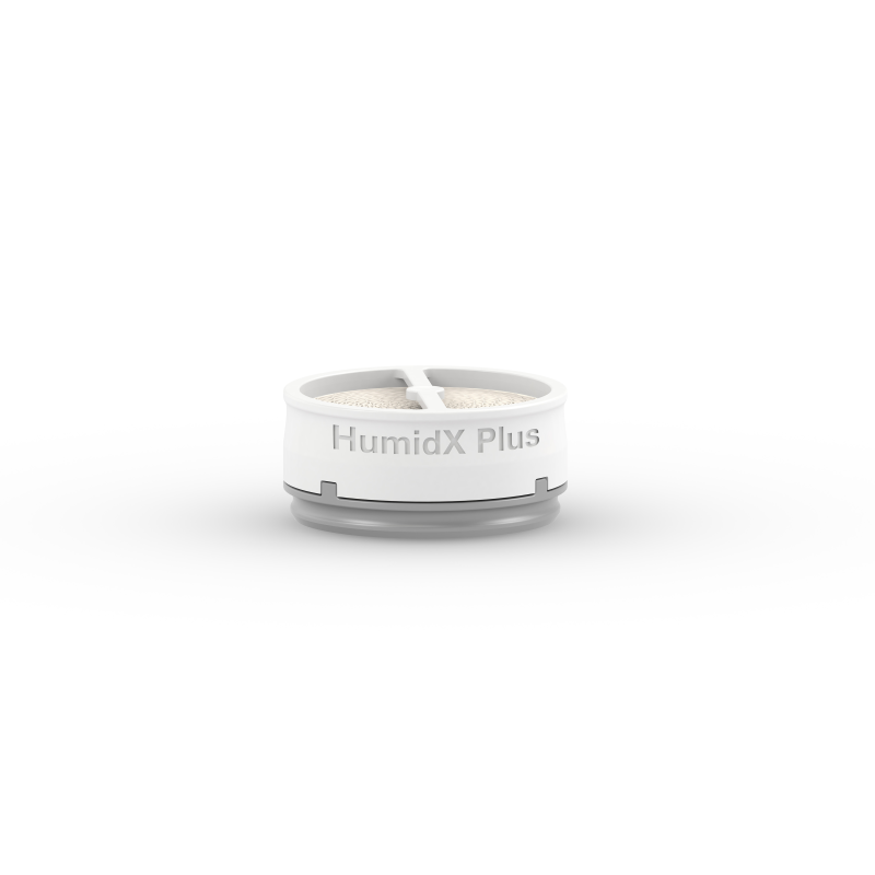 El HumidX Plus™ de ResMed es un sistema de humidificación sin agua diseñado para utilizarse con el equipo CPAP portátil AirMini.